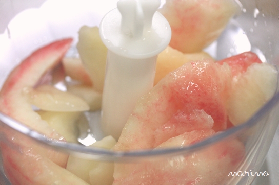 1)桃の果肉とレモン果汁をフードプロセッサーにかけてジュース状にして、ボウルに移す。