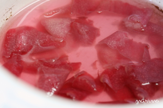 2)小鍋に★を入れ火にかけ、グラニュー糖と転化糖が溶けるまでかき混ぜる。液体がピンク色になったらOK。