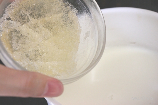 3)沸騰直前80℃になったら火を止めて、ふやけたゼラチンを入れる。木べらで混ぜて良く溶かす。
