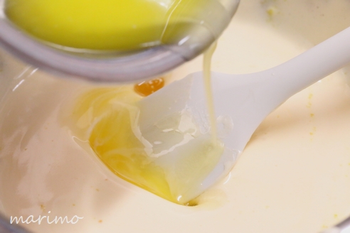4)溶かしバターを加え、底から返すようにゴムべらで混ぜる。 ※溶かしバターは冷えていると混ざりにくいので、人肌程度に温めておきます。