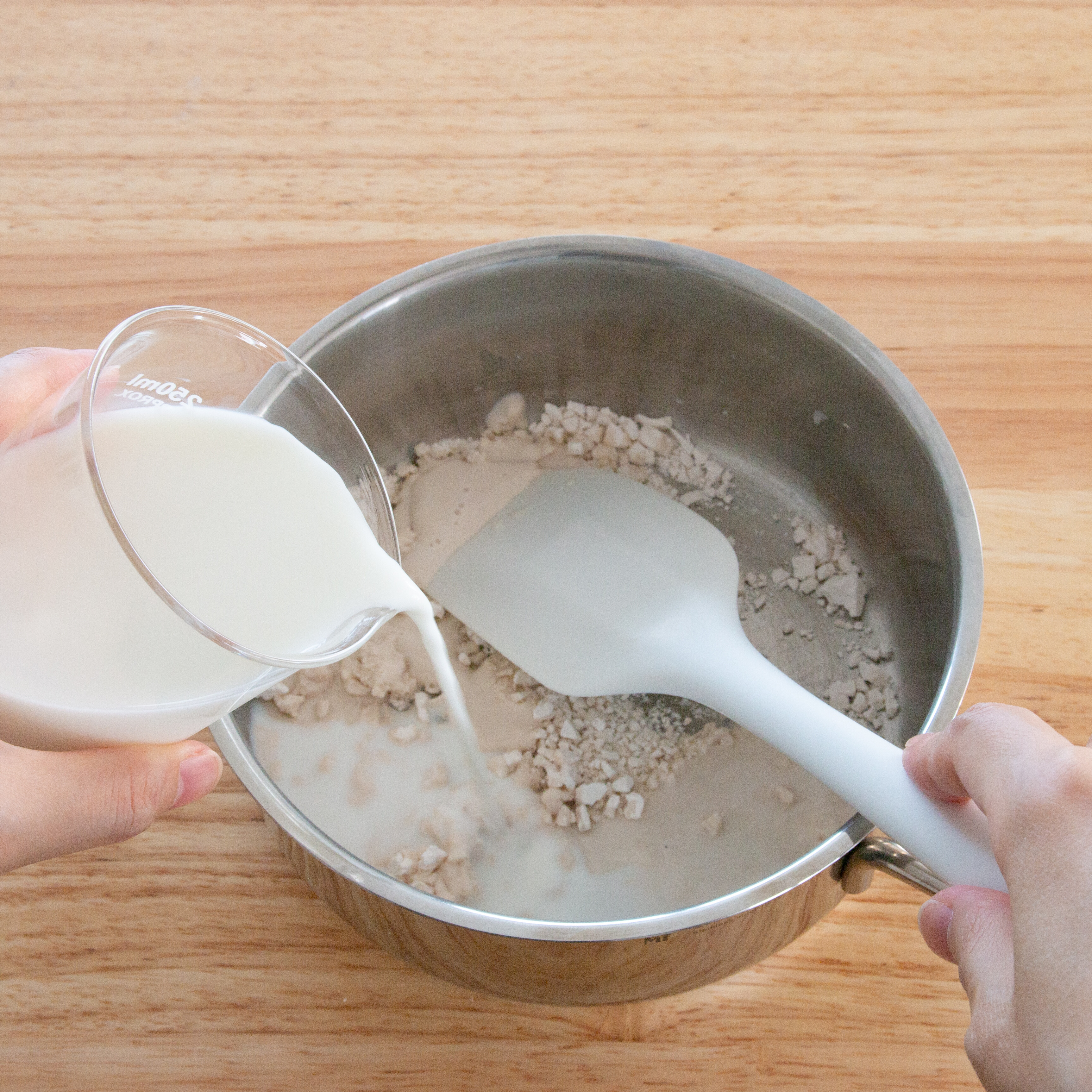 わらび粉に水(今回は牛乳)を加えて
